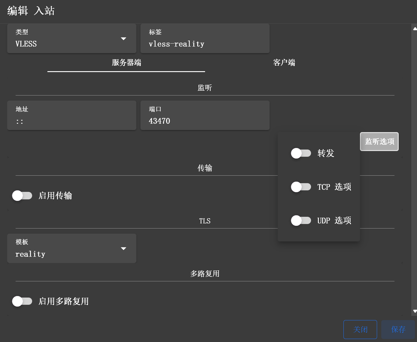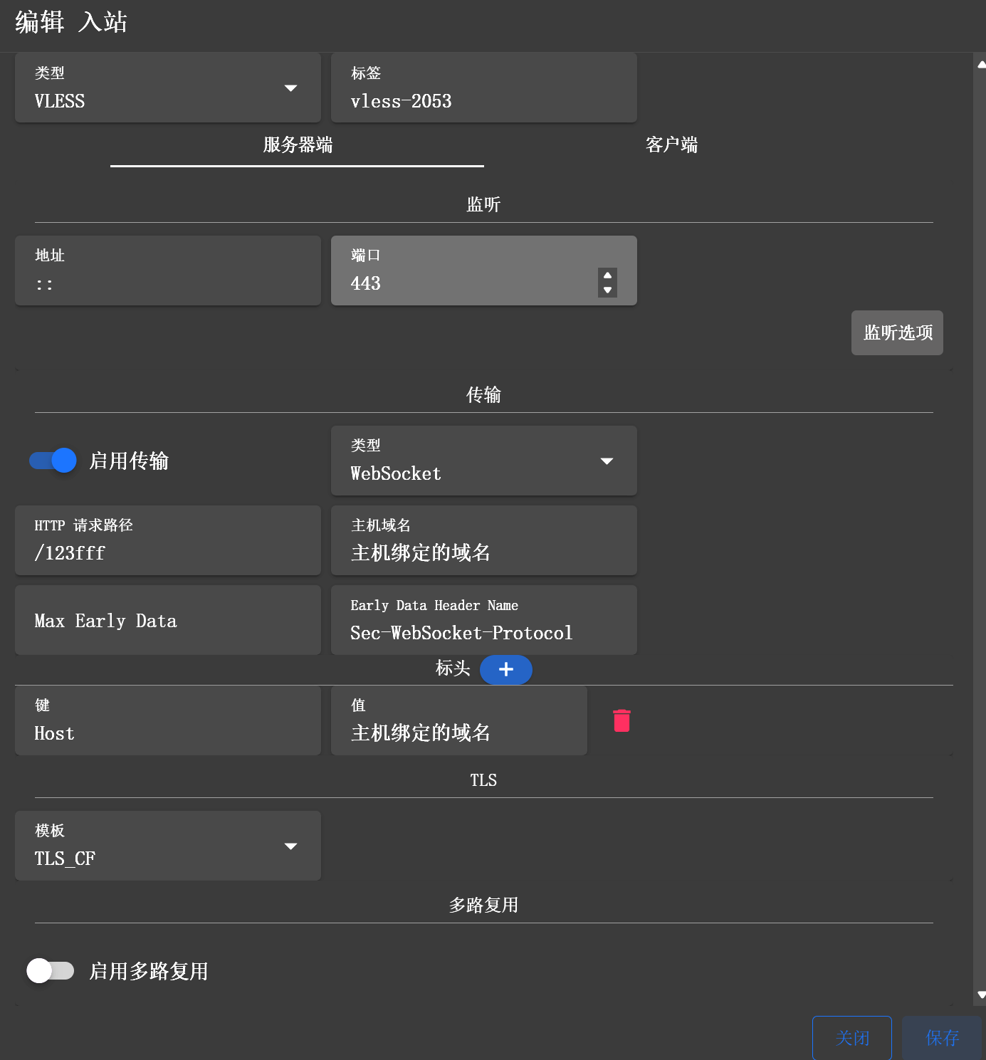 这里端口需要是CF支持的端口,这样才能套CF,注意用户管理->编辑->配置->把vless的flow删了